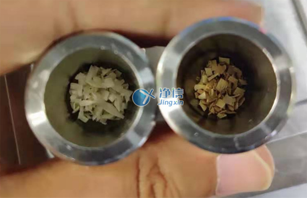 上圖為1分鐘的研磨效果,已經完全研磨至粉末。效果非常好,蠶繭研磨一定要凍液氮,因為蠶繭韌性極高,常溫研磨難度極高,之前老師了解過刀式研磨儀損耗也多,而且產熱容易變質,后續老師還會做到更多生物兼容性材料如滌綸、ps、pcl等等,凈信研磨儀都完全能勝任,經過多次了解和對比所以老師們選用凈信研磨儀代替人工處理。效率高,效果好,很好的解決了老師的研磨問題。