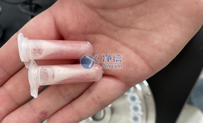 實驗開始客戶使用自配的離心管進行研磨,兩個樣品,另外添加兩個凈信生產的加厚研磨管進行四角配平,時間30s,功率調到4檔。客戶的離心管很薄,立馬被擊碎,凈信加厚研磨管沒有破裂但也出現了較嚴重磨損。