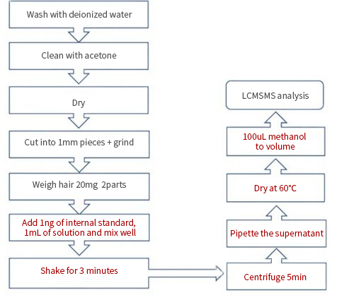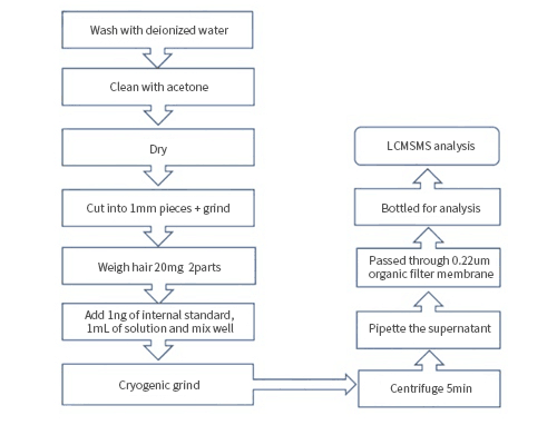 2. In the standard, the hair is washed, dried, cut into pieces, weighed, and ground after adding the internal standard solution.