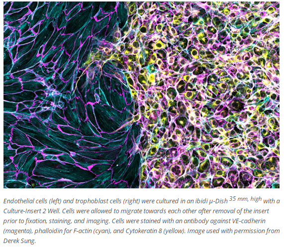 Endothelial cells cultured in a μ-Dish 35 mm, high with a Culture-Insert 2 Well. Image by Derek Sung, University of Pennsylvania School of Medicine, USA.