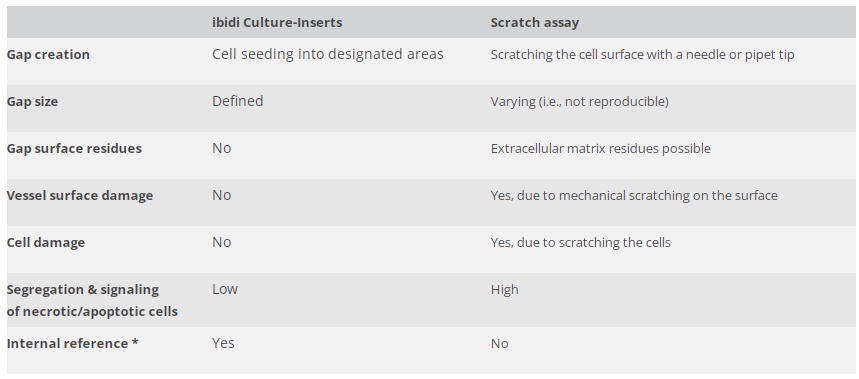 At first glance, the methods of scratching and placing a Culture-Insert seem to be two very similar approaches to create a cell-free gap. However, at a closer look, these two methods differ in important aspects that could influence the outcome of the assay: