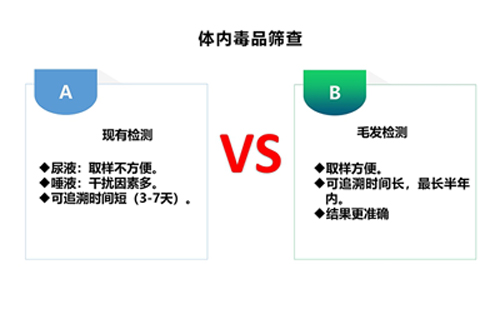 現今比較常見的毒檢測大致有:尿液、唾液、血液、毛發,不同種類的檢材具有不同的吸毒追溯期,目前以尿液檢測較為常見。但是,體液檢查會受到時間的影響。與尿液、血液等檢材相比,毛發樣品顯著的優勢是它延長了吸毒追溯期。毒品隨著血液循環進入毛囊,毒品原體及其代謝物會被毛發中的角質蛋白固定,并穩定地保留在毛發中。