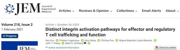 2020年10月27日,加州大學(xué)圣地亞哥分校醫(yī)學(xué)院,聯(lián)合法國(guó)圖盧茲大學(xué)和康涅狄格大學(xué)衛(wèi)生院的科學(xué)家在Journal of Experimental Medicine(JEM) 上在線發(fā)表了題為Distinct Integrin Activation Pathways for Effector and Regulatory T cell Trafficking and Function的工作(來自作者為孫昊博士)。