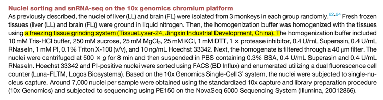 Tissuelyser-24L發(fā)揮了不可或缺的作用。研究團(tuán)隊利用這種凈信的組織研磨儀,從雄性獼猴的肝臟和大腦中提取細(xì)胞核,為后續(xù)的單細(xì)胞RNA測序(snRNA-seq)分析奠定了基礎(chǔ)。通過精確的細(xì)胞核分離和高質(zhì)量的樣本制備,研究人員能夠深入探究二甲雙胍對細(xì)胞老化的具體影響,從而揭示了其在延緩衰老中的分子機(jī)制。
