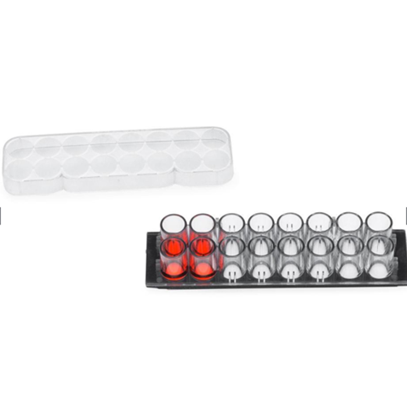 蓋玻片上的腔室共16個,分2排,各8孔(如圖示),每孔的內直徑6mm。設計的每孔體積和孔距與標準96孔板的相同,無細胞毒性的硅膠孔墊片(silicone well gasket)與上層聚苯乙烯材料的腔室(the upper structure,厚0.5mm)和基層的硼硅酸鹽蓋玻片(the substructure,厚0.16-.19mm)形成滴水不漏的密封。有上層腔室時每孔體積250μl,去掉上層腔室后每孔體積9μl。