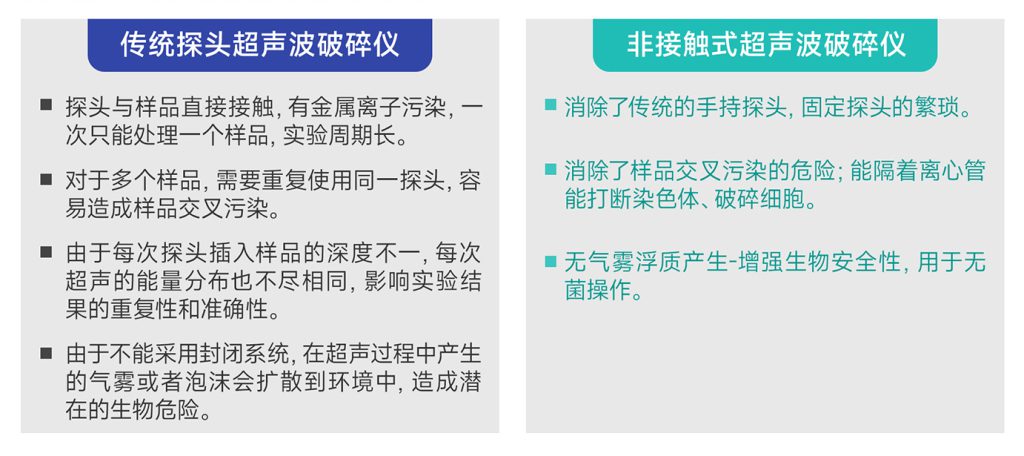 采用超聲波磁致伸縮的原理,把超聲波波形聚焦在液體中,使超聲波能量有質(zhì)的轉(zhuǎn)變。傳統(tǒng)的探頭超聲波破碎儀,探頭與樣品直接接觸,一次只能處理一個樣品,實驗周期長;對于多個樣品,需要重復(fù)使用同一探頭,容易造成樣品交叉污染。由于每次探頭插入樣品的深度不同,每次超聲的能量分布也不盡相同,影響實驗結(jié)果的重復(fù)性和準(zhǔn)確性。此外,由于不能采用封閉系統(tǒng),在超聲過程中產(chǎn)生的氣霧或者泡沫會擴(kuò)散到環(huán)境中,造成潛在的生物危險。